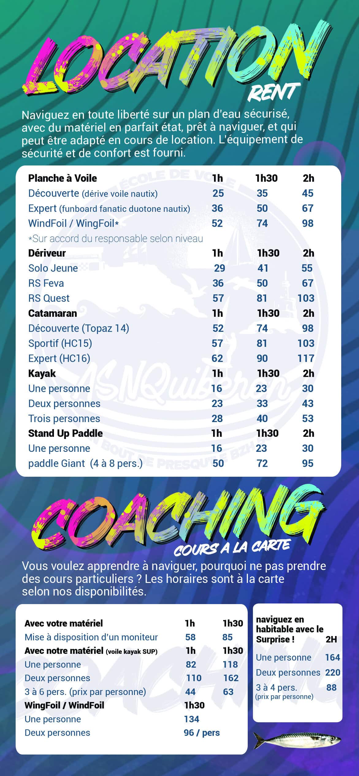 - DÉRIVEURS : RS Quest, RS Feva, Open Bic, Optimist (caution 300€)